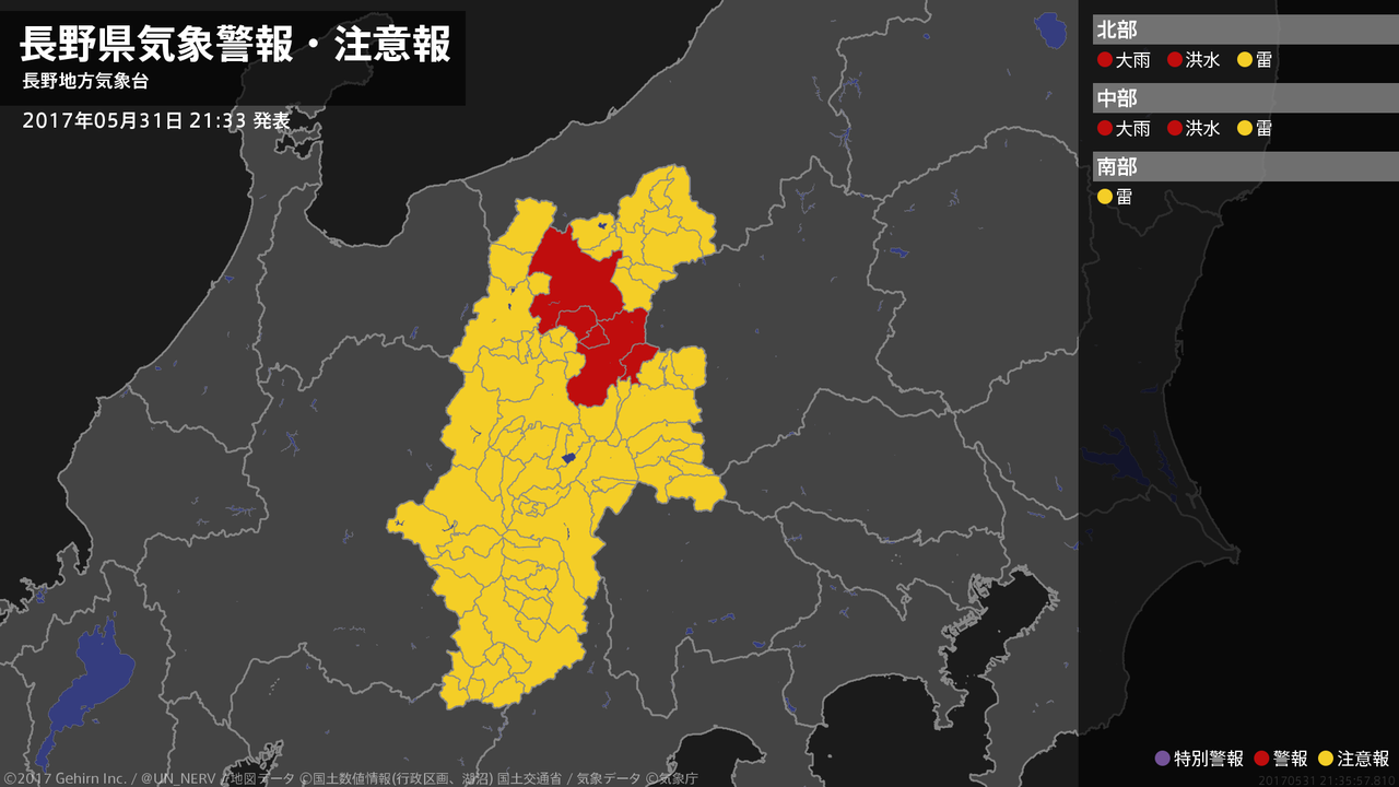 【長野県 気象警報 2017年05月31日 21:35】北部、中部では、31日夜遅くまで低い土地の浸水や河川の増水に警戒してください。#気象警報 #気象警報注意報 #長野県