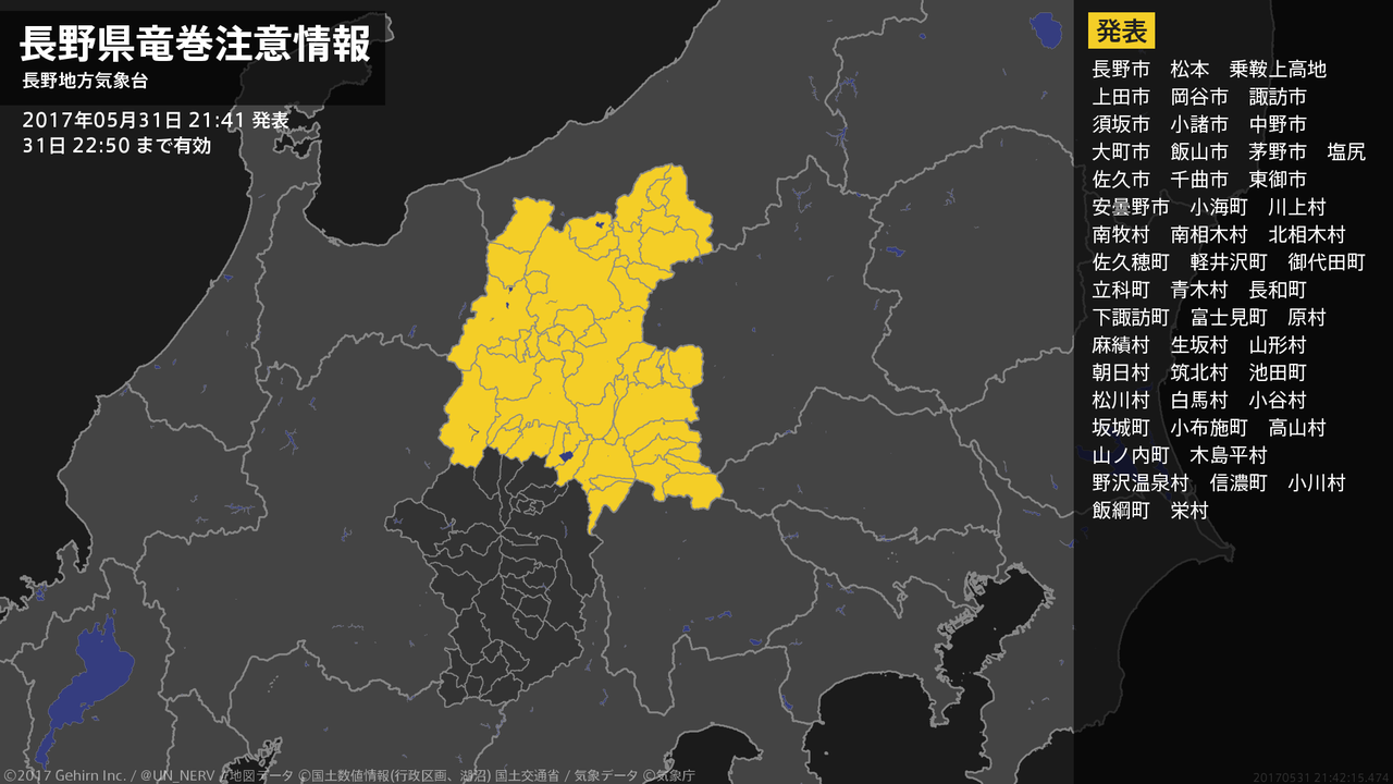 【長野県 竜巻注意情報】長野県は、竜巻などの激しい突風が発生しやすい気象状況になっています。頑丈な建物内に移動するなど安全確保に努めてください。この情報は31日23:50まで有効です。#竜巻注意情報 #長野県