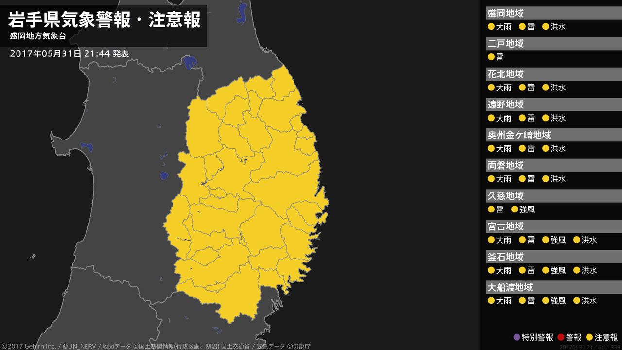 【岩手県 気象警報・注意報 2017年05月31日 21:46】岩手県では、31日夜遅くまで低い土地の浸水や河川の増水、竜巻などの激しい突風、落雷に注意してください。沿岸北部、沿岸南部では、1日朝から1日夕方まで強風に注意してください。#気象警報注意報 #岩手県