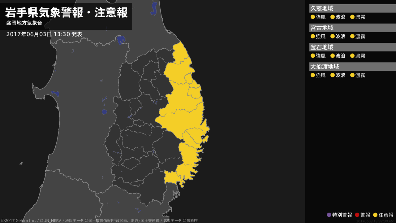 【岩手県 気象警報・注意報 2017年06月03日 13:32】沿岸北部、沿岸南部では、4日明け方まで強風に、3日夜のはじめ頃まで高波に、4日昼前まで濃霧による視程障害に注意してください。#気象警報注意報 #岩手県