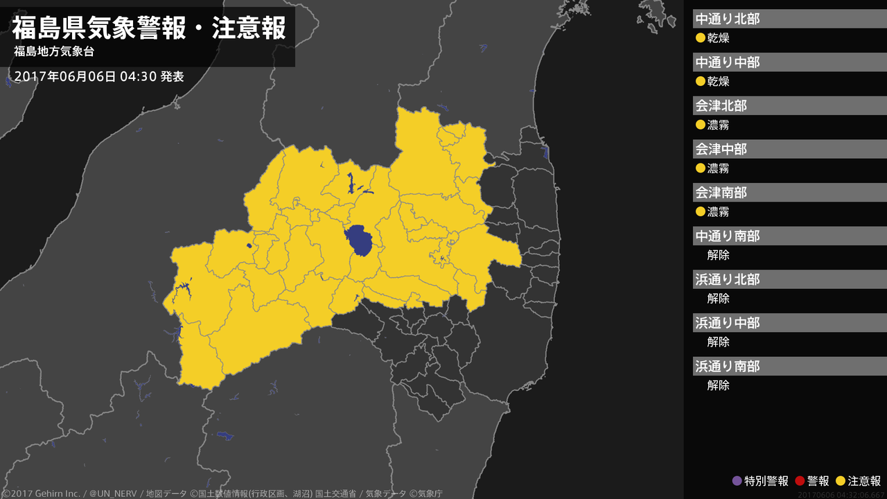 【福島県 気象警報・注意報 2017年06月06日 04:32】会津では、6日昼前まで濃霧による視程障害に注意してください。中通りでは、7日まで空気の乾燥による火の取り扱いに注意してください。#気象警報注意報 #福島県