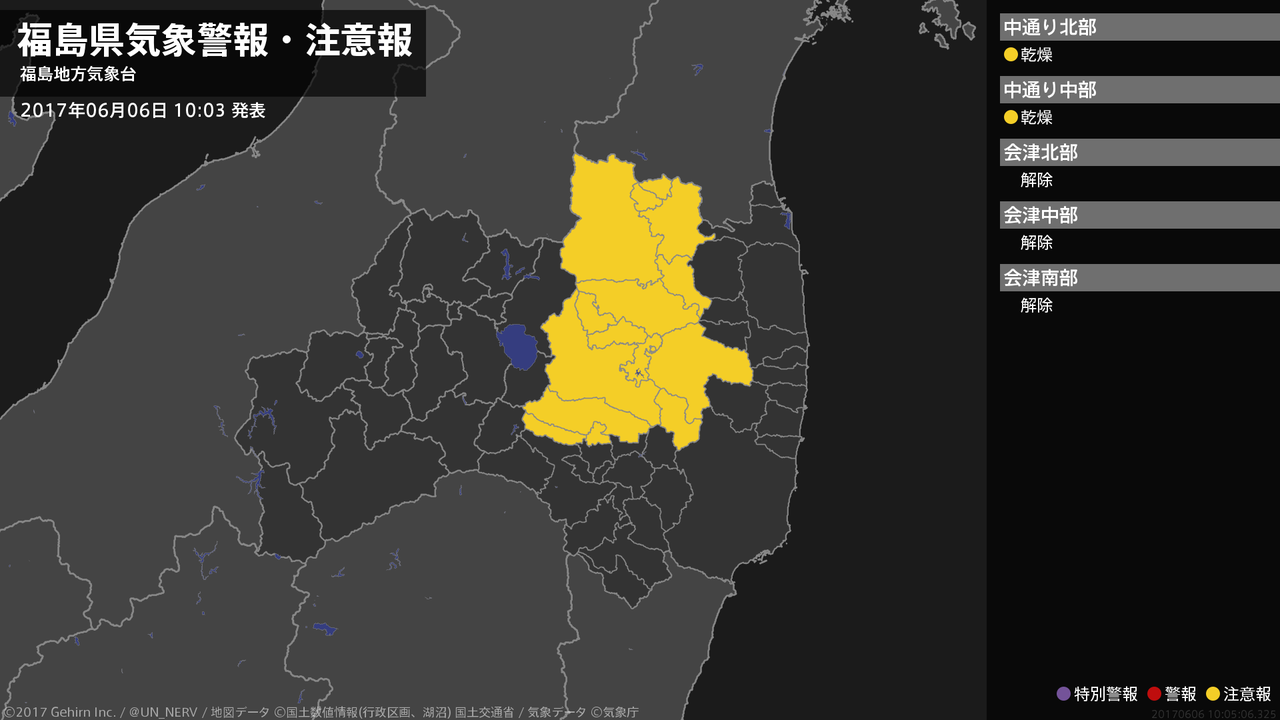 【福島県 気象警報・注意報 2017年06月06日 10:05】中通りでは、7日まで空気の乾燥による火の取り扱いに注意してください。#気象警報注意報 #福島県