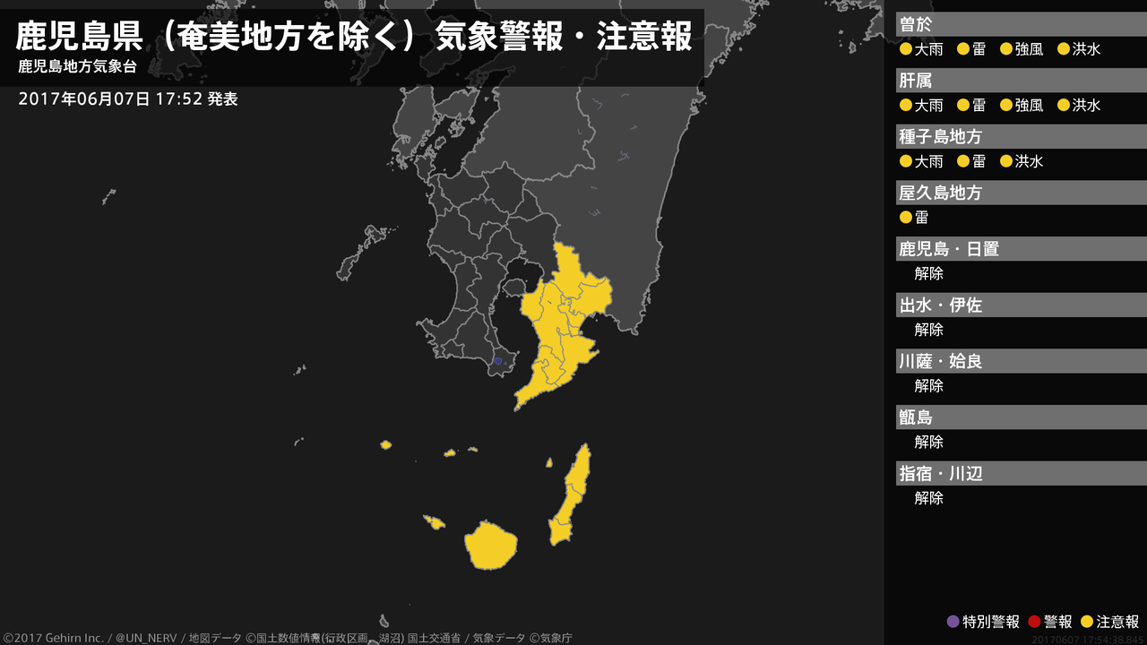 【鹿児島県(奄美地方を除く) 気象警報・注意報 2017年06月07日 17:54】