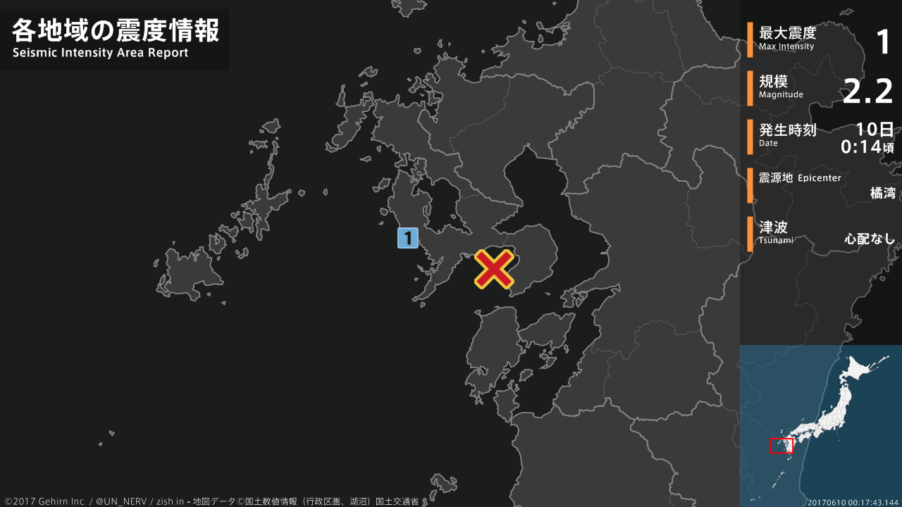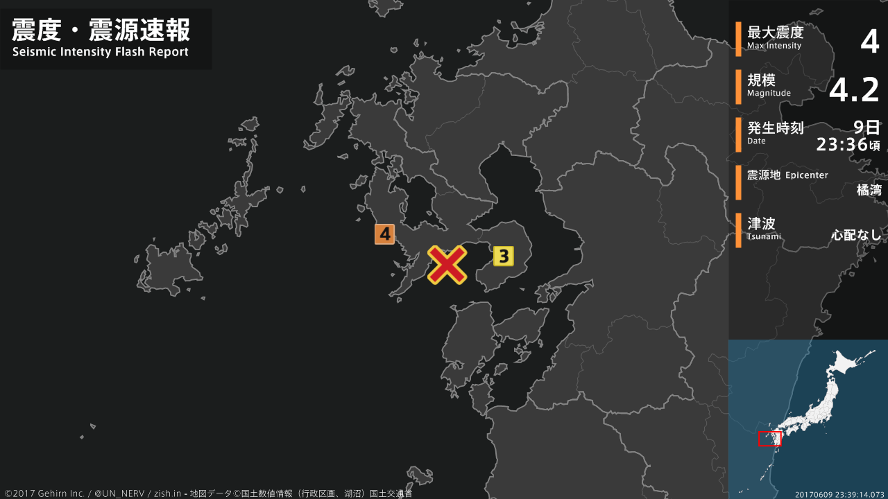 9日23時36分頃、橘湾を震源とする地震がありました。震源の深さは約20km、地震の規模はM4.2と推定されています。この地震による津波の心配はありません。