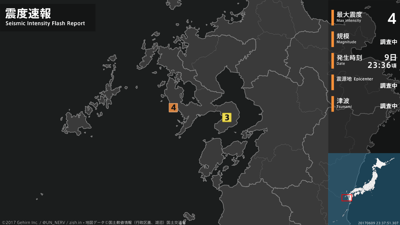 23時36分頃、橘湾を震源とする地震がありました。今後の情報に注意してください。