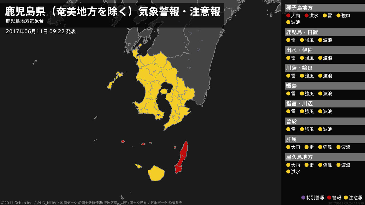 【鹿児島県(奄美地方を除く) 気象警報 2017年06月11日 09:24】種子島・屋久島地方では、11日昼過ぎまで低い土地の浸水や河川の増水に警戒してください。#気象警報 #気象警報注意報 #鹿児島県(奄美地方除く)