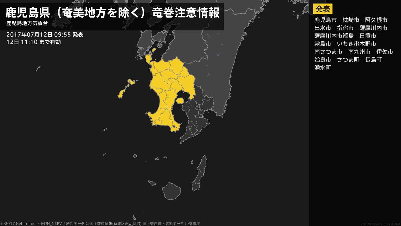 【鹿児島県(奄美地方を除く) 竜巻注意情報】