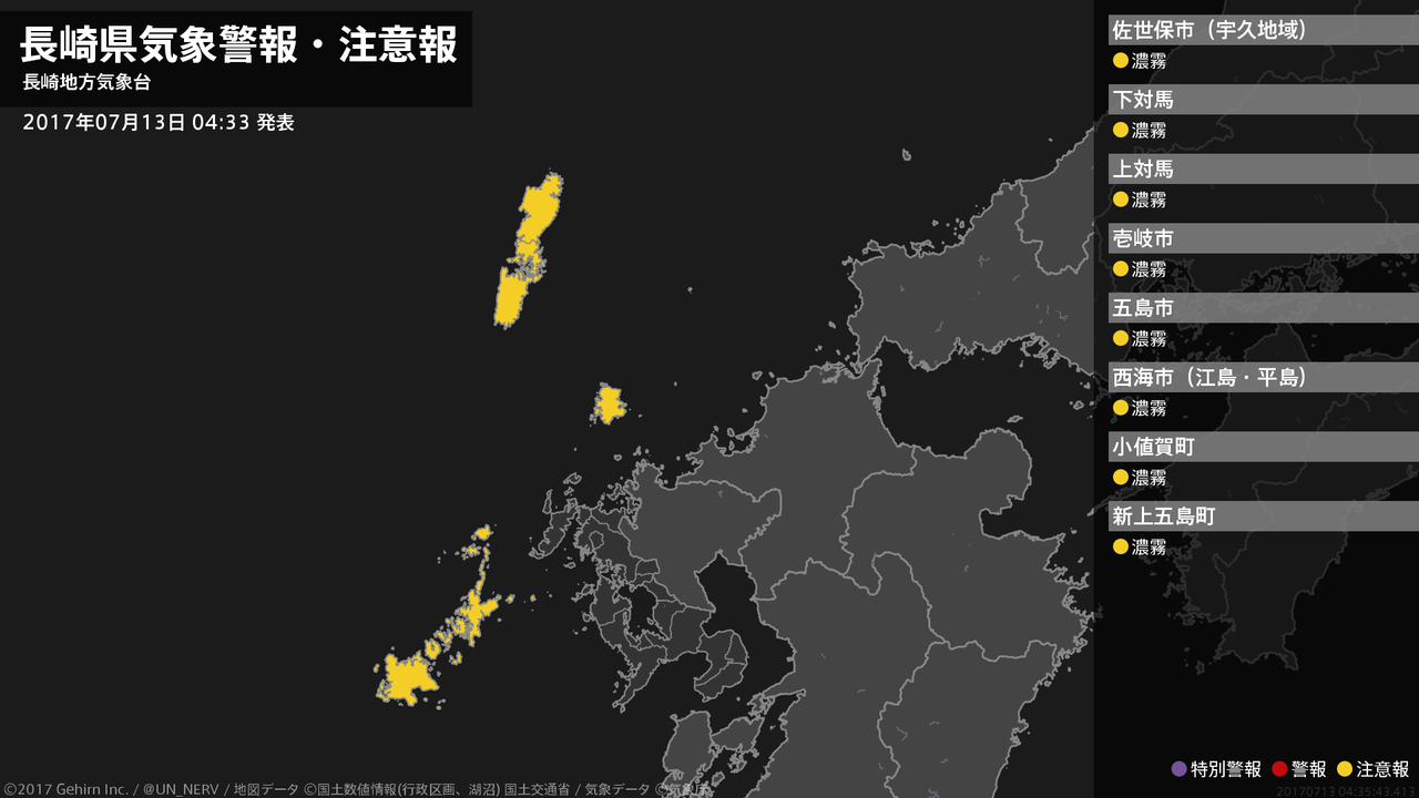 【長崎県 気象警報・注意報 2017年07月13日 04:35】壱岐・対馬、五島では、13日昼前まで濃霧による視程障害に注意してください。#気象警報注意報 #長崎県