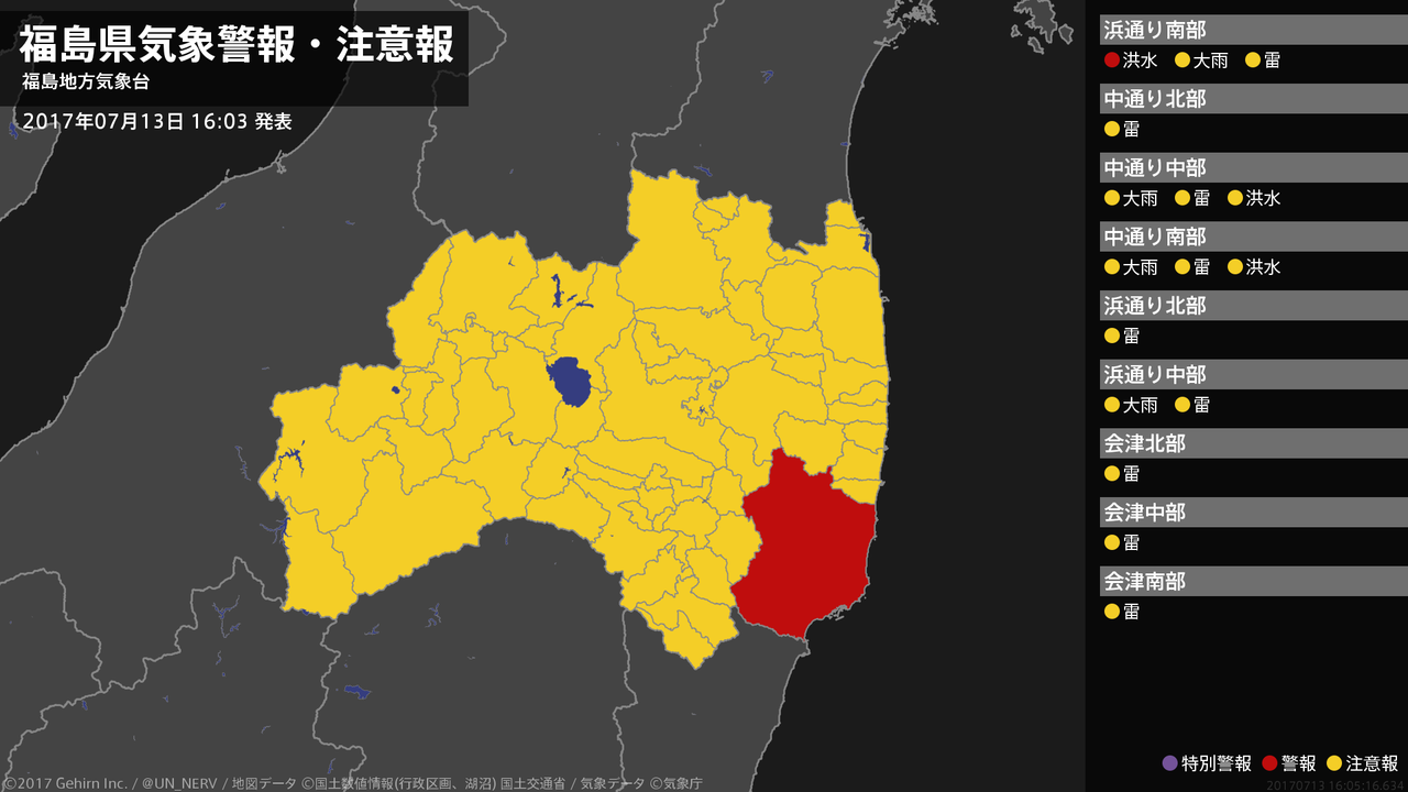 【福島県 気象警報 2017年07月13日 16:05】浜通りでは、13日夜のはじめ頃まで河川の増水に警戒してください。#気象警報 #気象警報注意報 #福島県