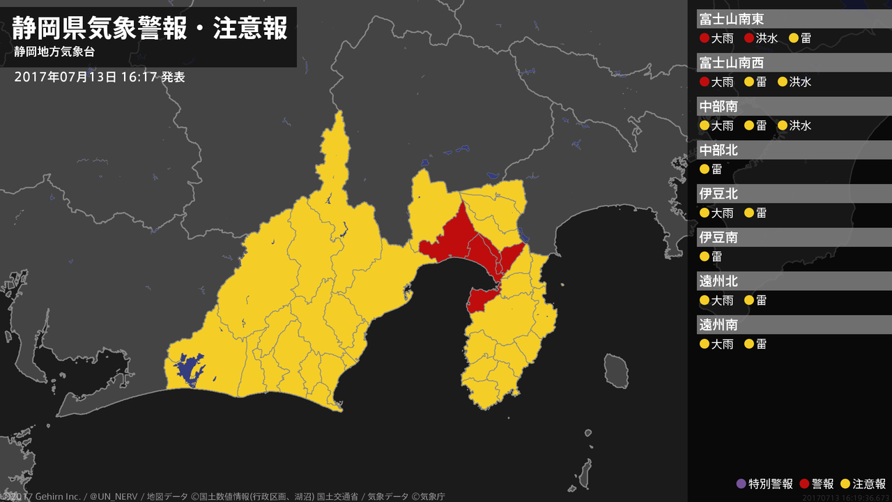 【静岡県 気象警報 2017年07月13日 16:19】東部では、13日夜のはじめ頃まで土砂災害に、13日夕方まで低い土地の浸水や河川の増水に警戒してください。#気象警報 #気象警報注意報 #静岡県