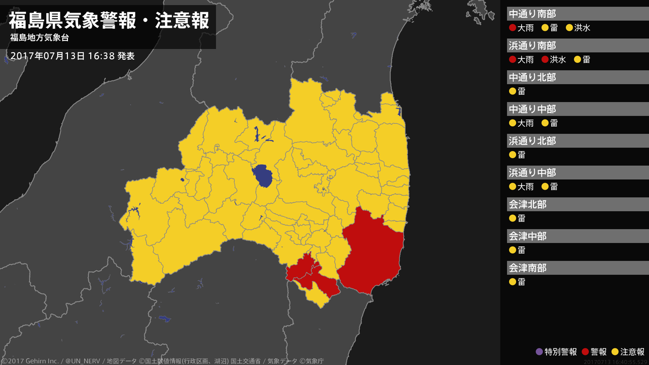 【福島県 気象警報 2017年07月13日 16:40】中通り、浜通りでは、13日夜遅くまで土砂災害に警戒してください。浜通りでは、13日夜のはじめ頃まで河川の増水に警戒してください。#気象警報 #気象警報注意報 #福島県