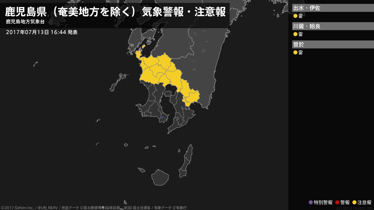 【鹿児島県(奄美地方を除く) 気象警報・注意報 2017年07月13日 16:46】薩摩、大隅地方では、13日夜のはじめ頃まで急な強い雨や落雷に注意してください。#気象警報注意報 #鹿児島県(奄美地方除く)