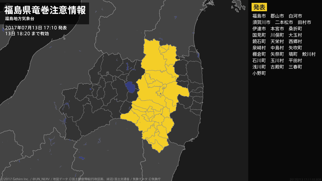 【福島県 竜巻注意情報】福島県は、竜巻などの激しい突風が発生しやすい気象状況になっています。頑丈な建物内に移動するなど安全確保に努めてください。この情報は13日18:20まで有効です。#竜巻注意情報 #福島県