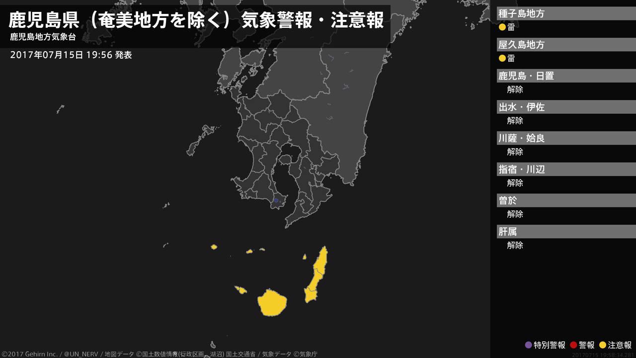 【鹿児島県(奄美地方を除く) 気象警報・注意報 2017年07月15日 19:58】