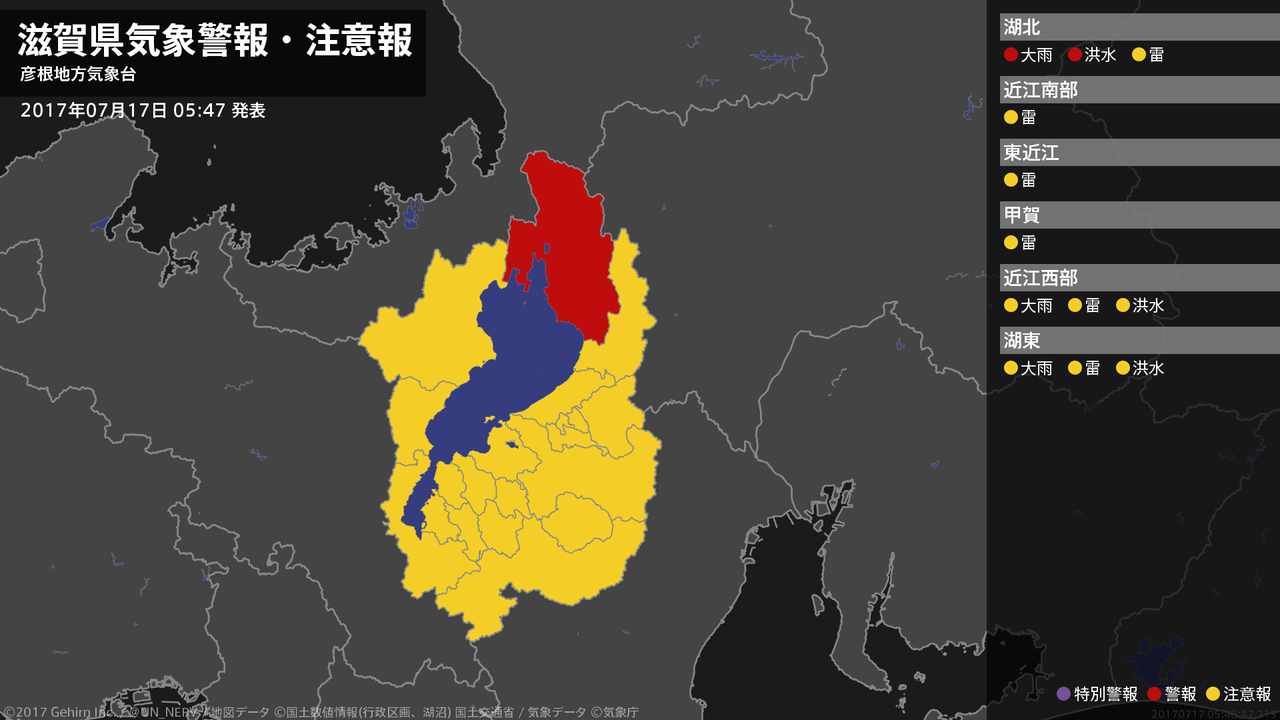 【滋賀県 気象警報・注意報 2017年07月17日 05:48】北部では、17日朝まで土砂災害や河川の増水に警戒してください。#気象警報注意報 #滋賀県