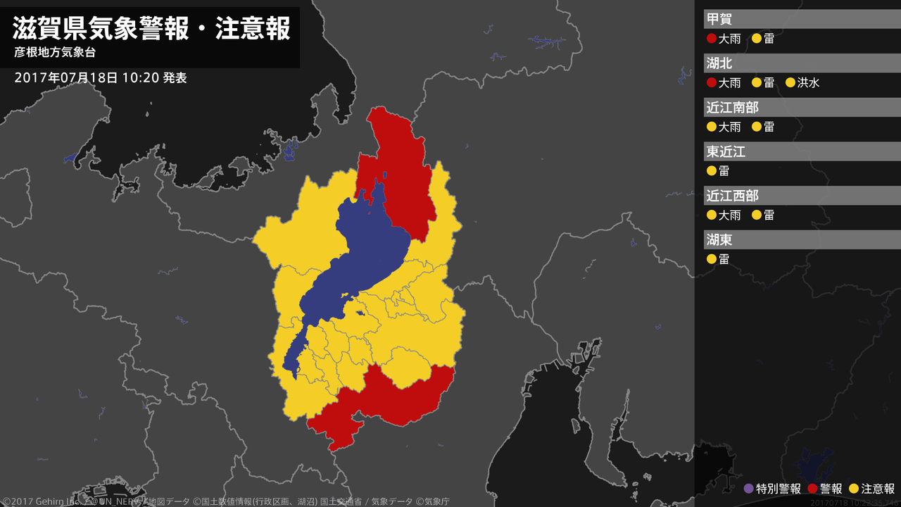 【滋賀県 気象警報・注意報 2017年07月18日 10:22】滋賀県では、18日夜のはじめ頃まで土砂災害に警戒してください。#気象警報注意報 #滋賀県