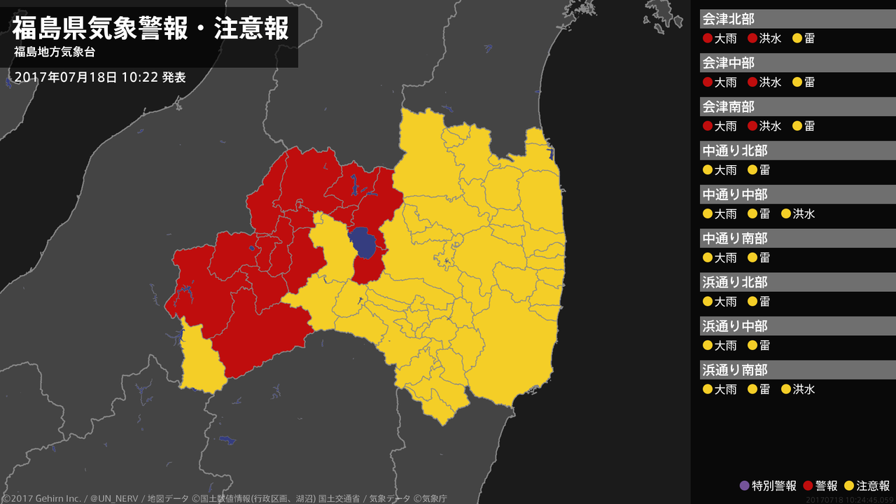 【福島県 気象警報 2017年07月18日 10:24】会津では、18日昼過ぎまで土砂災害に、18日夕方まで河川の増水に警戒してください。#気象警報 #気象警報注意報 #福島県