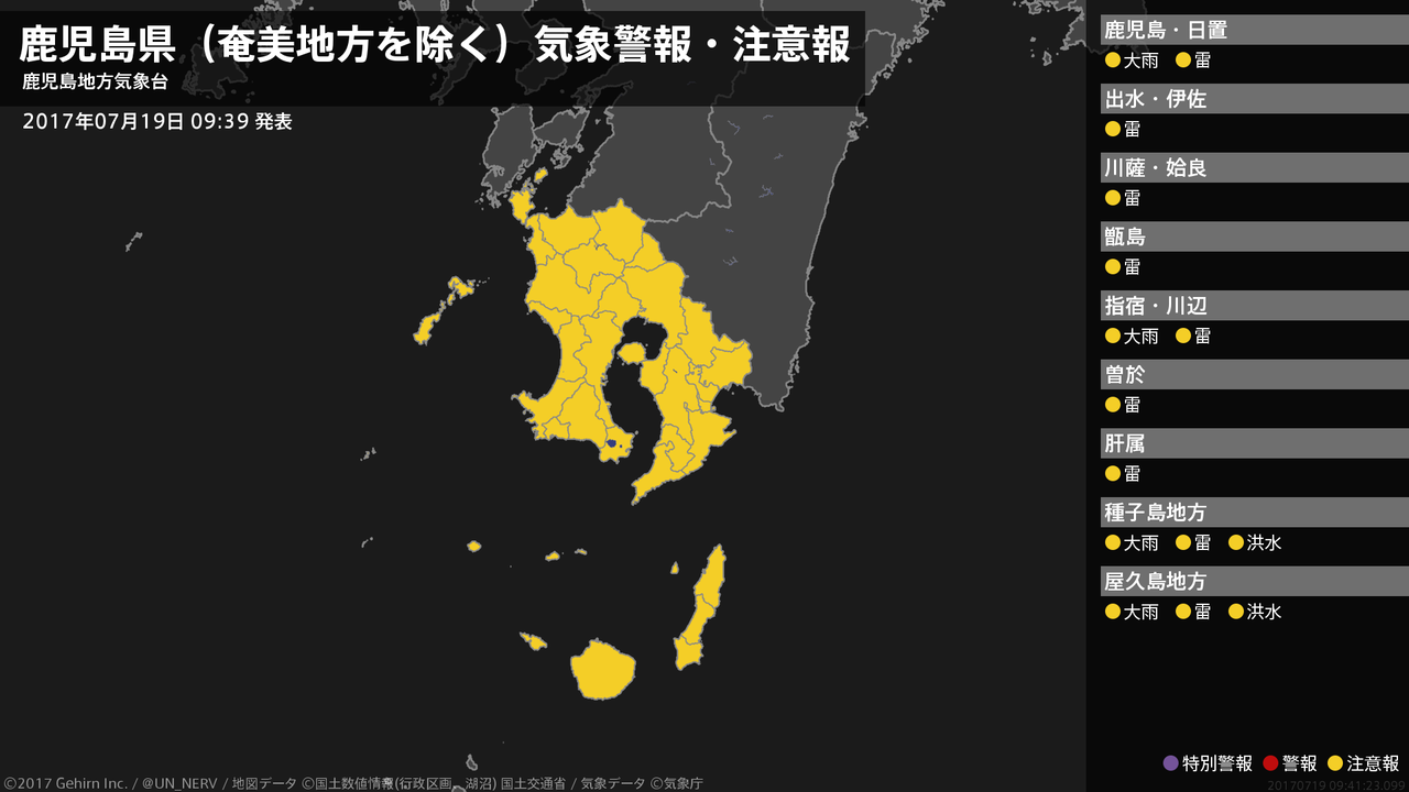 【鹿児島県(奄美地方を除く) 気象警報・注意報 2017年07月19日 09:41】薩摩、種子島・屋久島地方では土砂災害や低い土地の浸水に、種子島・屋久島地方では河川の増水に、薩摩、大隅、種子島・屋久島地方では落雷に注意してください。#気象警報注意報 #鹿児島県(奄美地方除く)