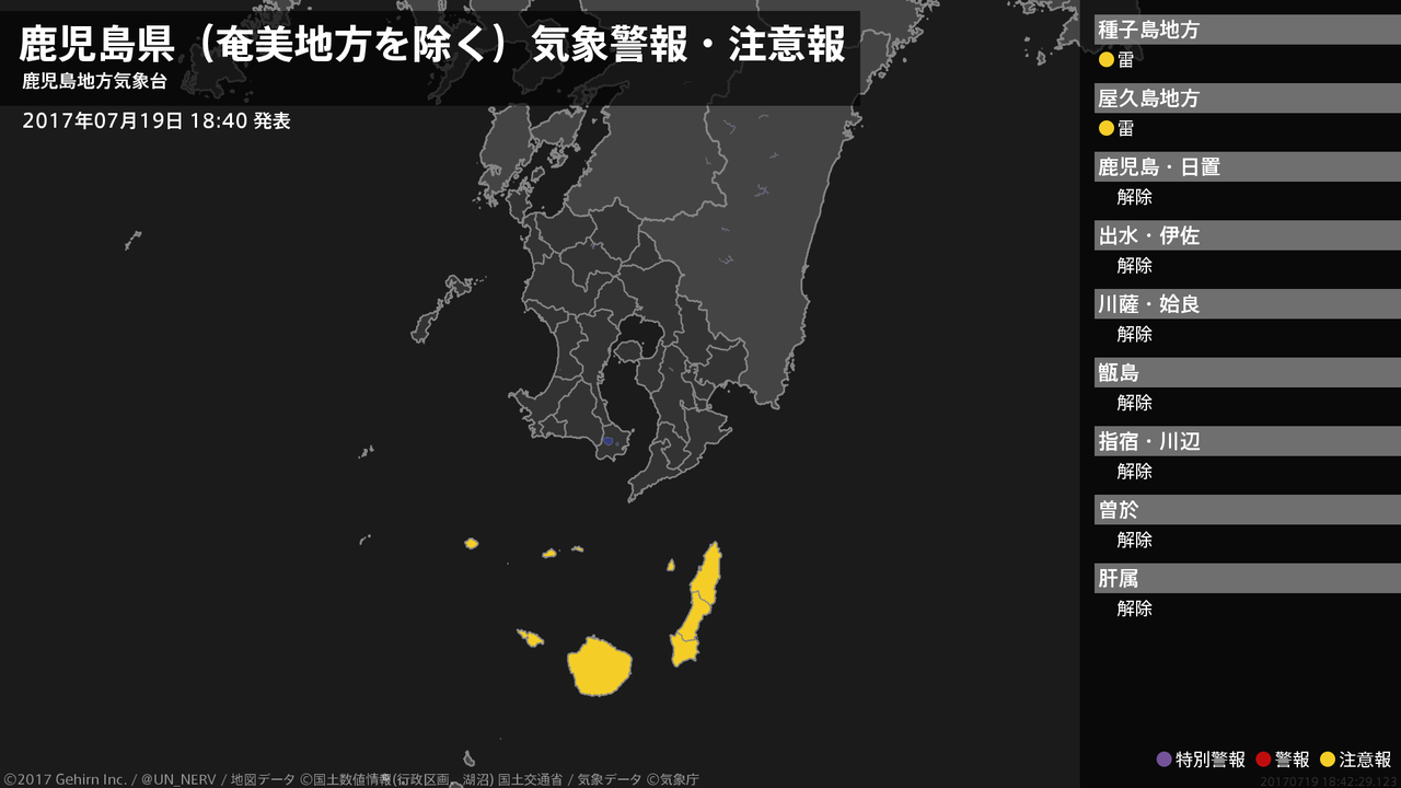 【鹿児島県(奄美地方を除く) 気象警報・注意報 2017年07月19日 18:42】