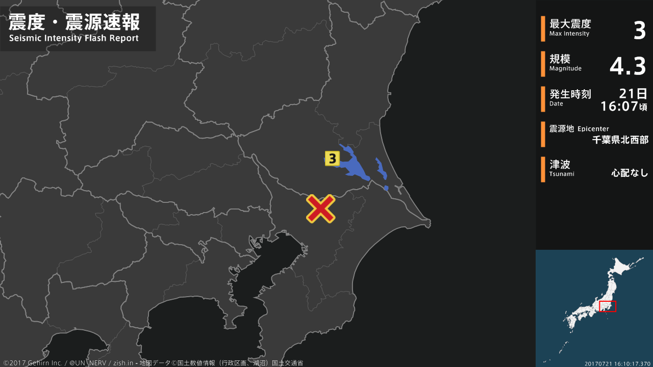 21日16時07分頃、千葉県北西部を震源とする地震がありました。震源の深さは約60km、地震の規模はM4.3と推定されています。この地震による津波の心配はありません。