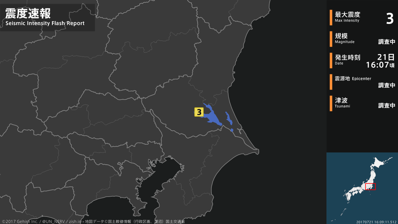 16時7分頃、千葉県北西部を震源とする地震がありました。震源の深さは約60km、地震の規模はM4.3程度、最大震度3程度以上と推定されています。詳しい情報が入り次第お伝えします。