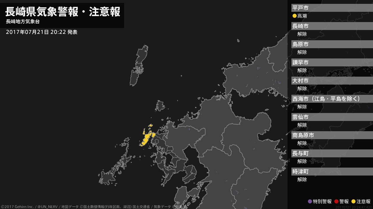 【長崎県 気象警報・注意報 2017年07月21日 20:24】北部では、ここしばらく高潮に注意してください。#気象警報注意報 #長崎県
