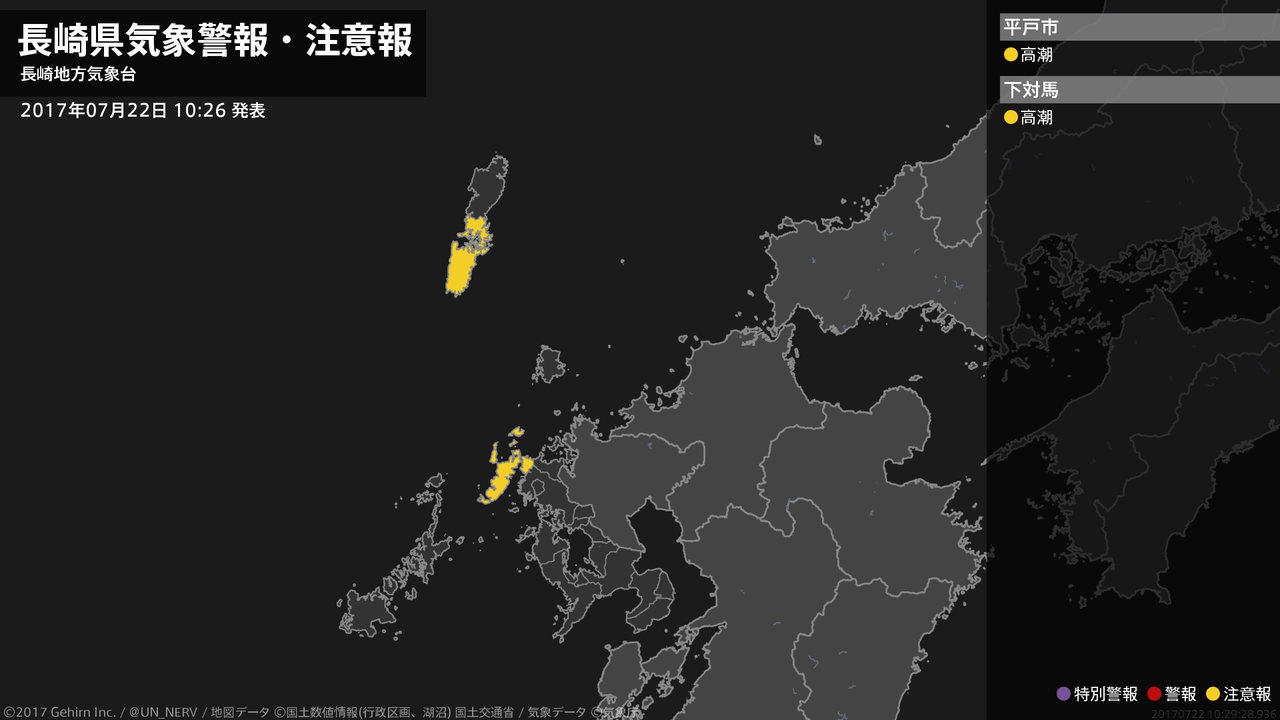 【長崎県 気象警報・注意報 2017年07月22日 10:29】北部、壱岐・対馬では、ここしばらく高潮に注意してください。#気象警報注意報 #長崎県