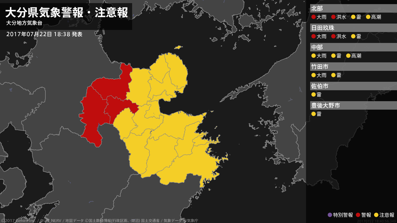 【大分県 気象警報・注意報 2017年07月22日 19:10】北部、西部では、22日夜のはじめ頃まで土砂災害や河川の増水に警戒してください。西部では、22日夜のはじめ頃まで低い土地の浸水に警戒してください。#気象警報注意報 #大分県