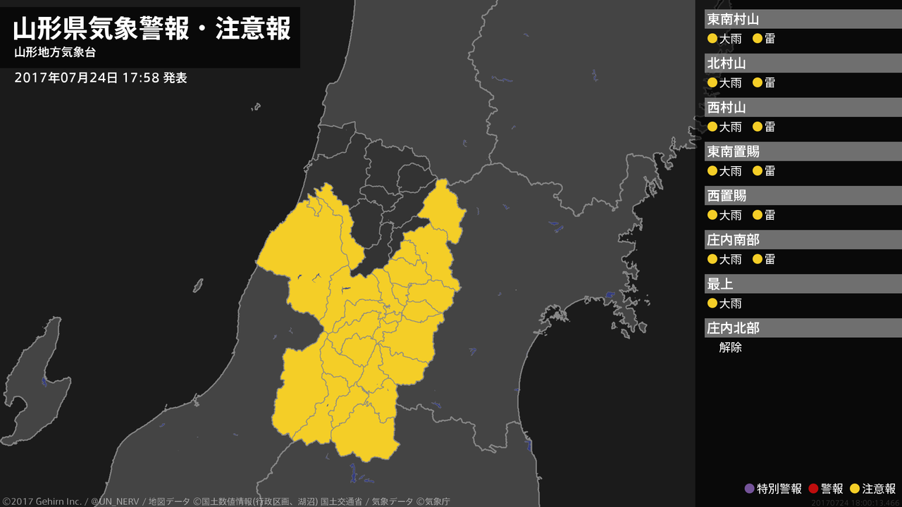 【山形県 気象警報(解除) 2017年07月24日 18:00】山形県に発表されていた気象警報はすべて解除されました。#気象警報 #山形県