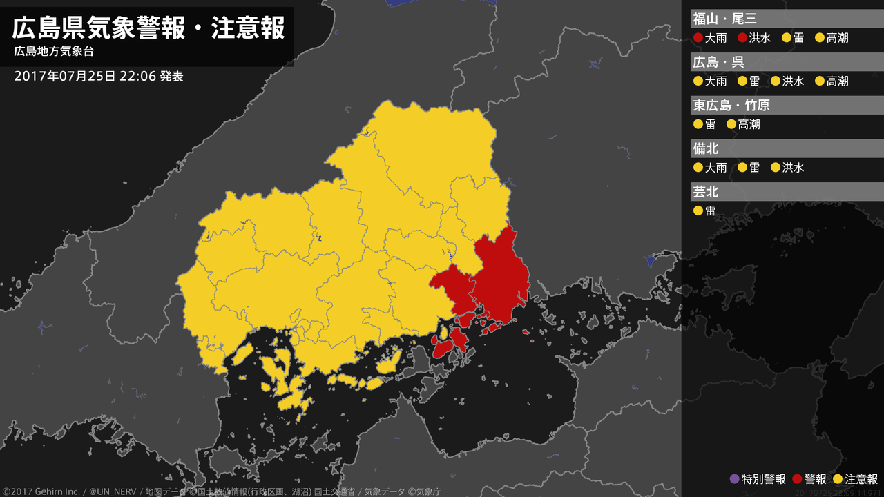 【広島県 気象警報 2017年07月25日 22:09】南部では、26日明け方まで低い土地の浸水や河川の増水に警戒してください。#気象警報 #気象警報注意報 #広島県