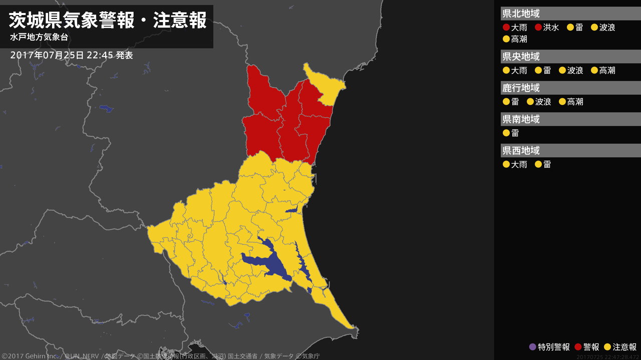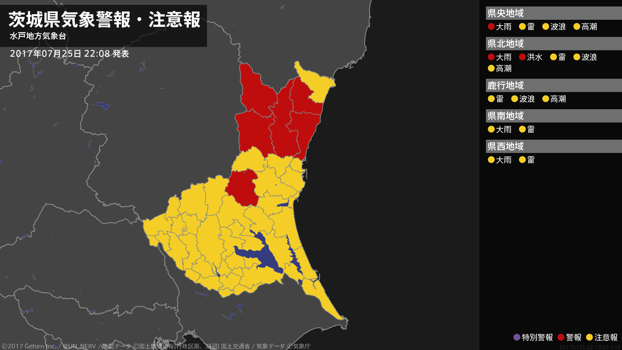 【茨城県 気象警報 2017年07月25日 22:47】北部では、26日明け方まで土砂災害に、26日未明まで河川の増水に警戒してください。#気象警報 #気象警報注意報 #茨城県