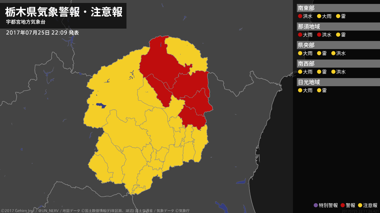 【栃木県 気象警報 2017年07月25日 22:11】北部では、25日夜遅くまで土砂災害や低い土地の浸水に警戒してください。栃木県では、25日夜遅くまで河川の増水に警戒してください。#気象警報 #気象警報注意報 #栃木県