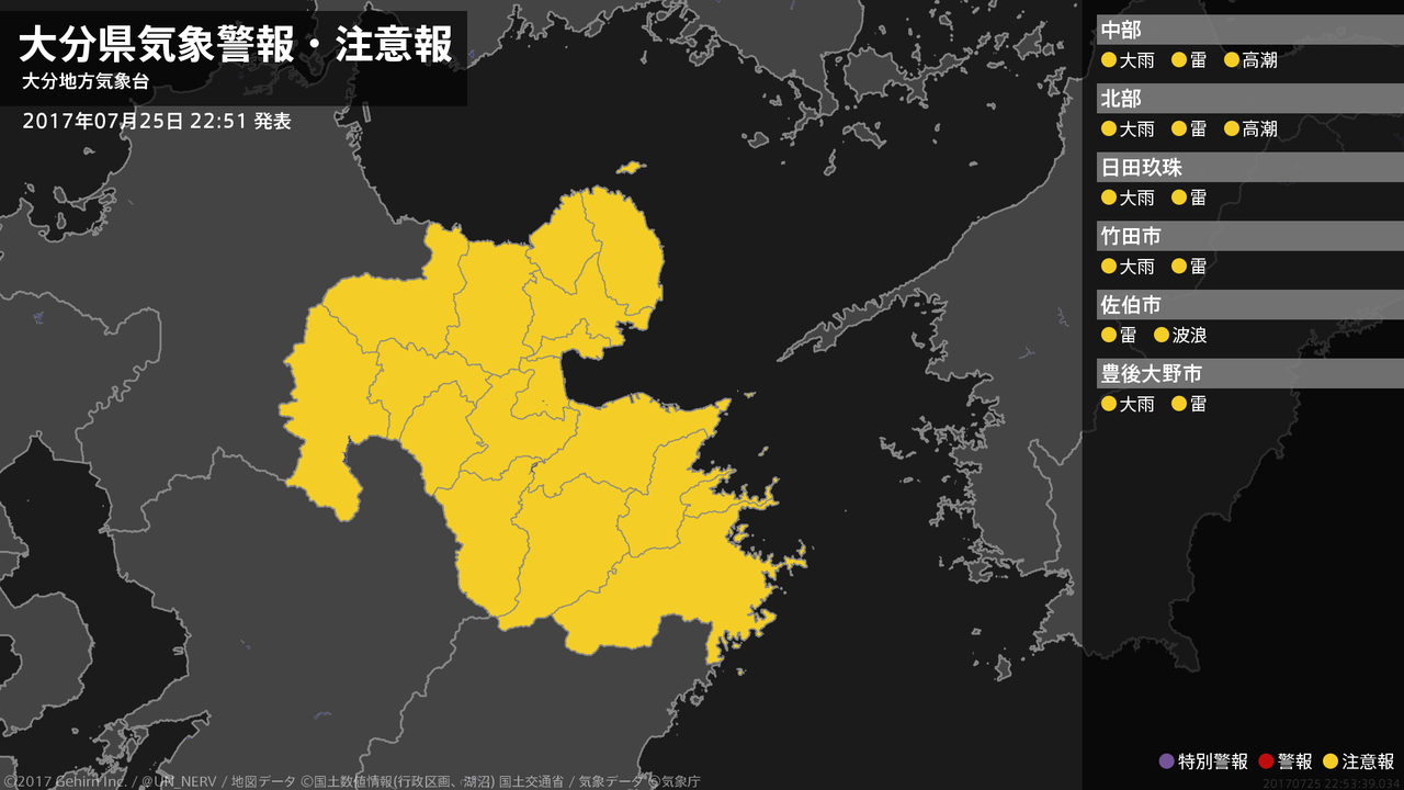 【大分県 気象警報・注意報 2017年07月25日 22:53】大分県では、26日明け方まで土砂災害に、26日未明まで落雷に注意してください。南部では、26日夜遅くまで高波に注意してください。中部、北部では、26日まで高潮に注意してください。#気象警報注意報 #大分県