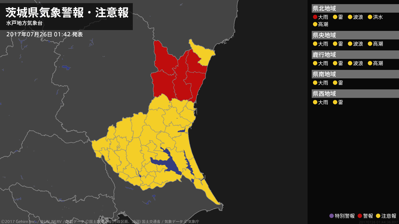 【茨城県 気象警報 2017年07月26日 01:44】北部では、26日明け方まで土砂災害に警戒してください。#気象警報 #気象警報注意報 #茨城県