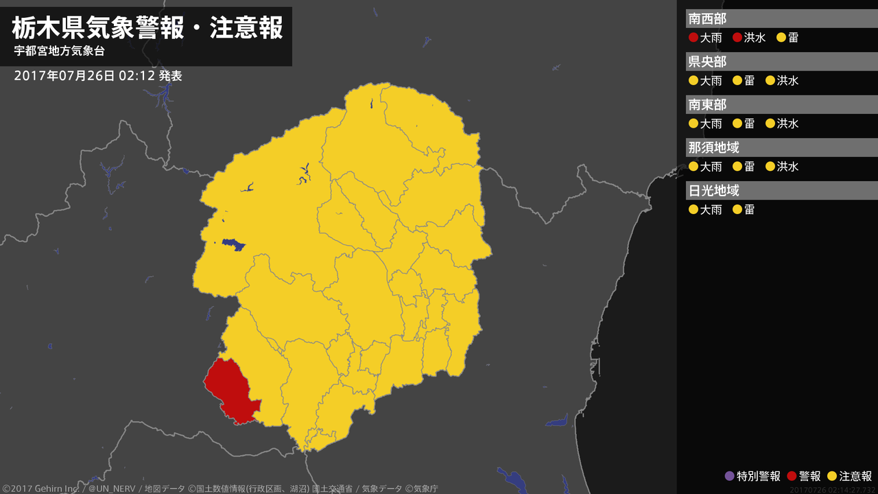 【栃木県 気象警報 2017年07月26日 02:14】南部では、26日明け方まで低い土地の浸水や河川の増水に警戒してください。#気象警報 #気象警報注意報 #栃木県
