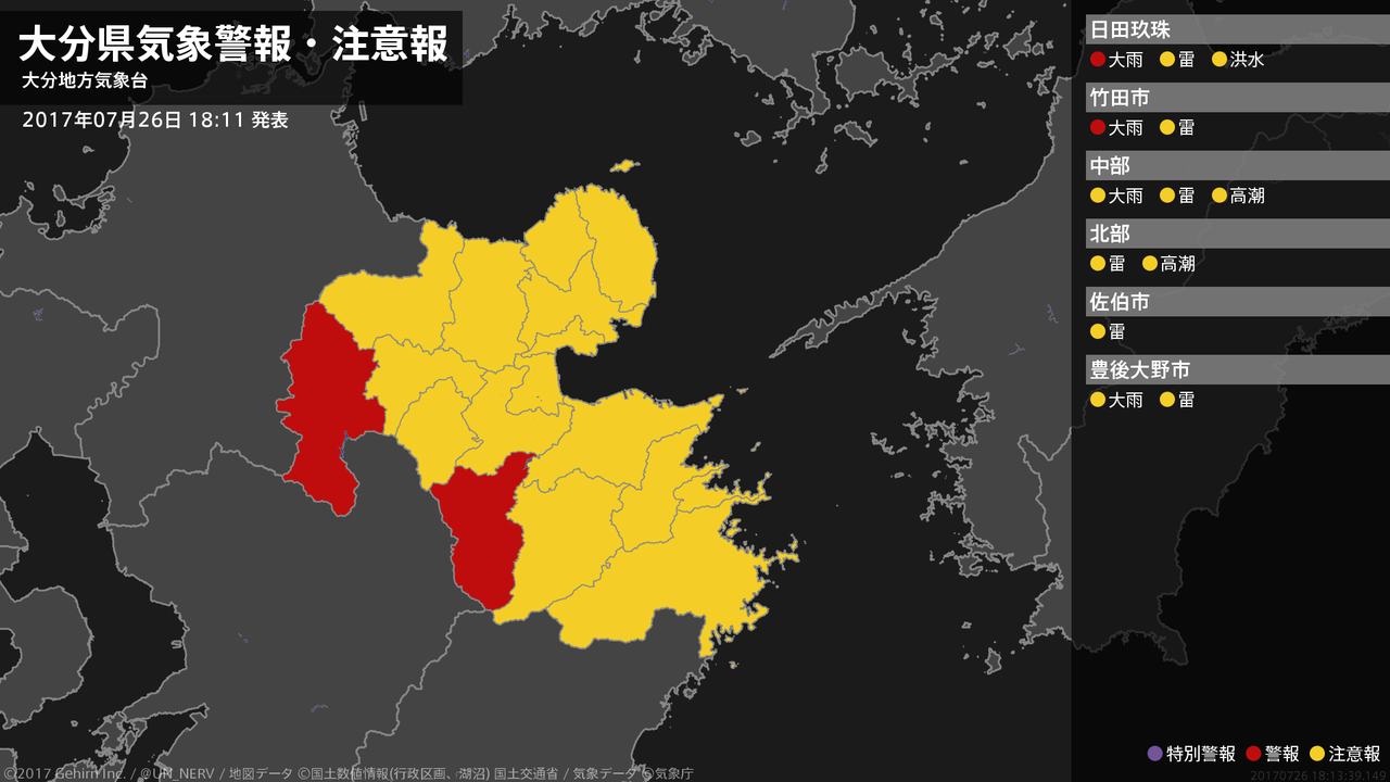 【大分県 気象警報・注意報 2017年07月26日 18:13】西部では、26日夜遅くまで土砂災害に警戒してください。#気象警報注意報 #大分県