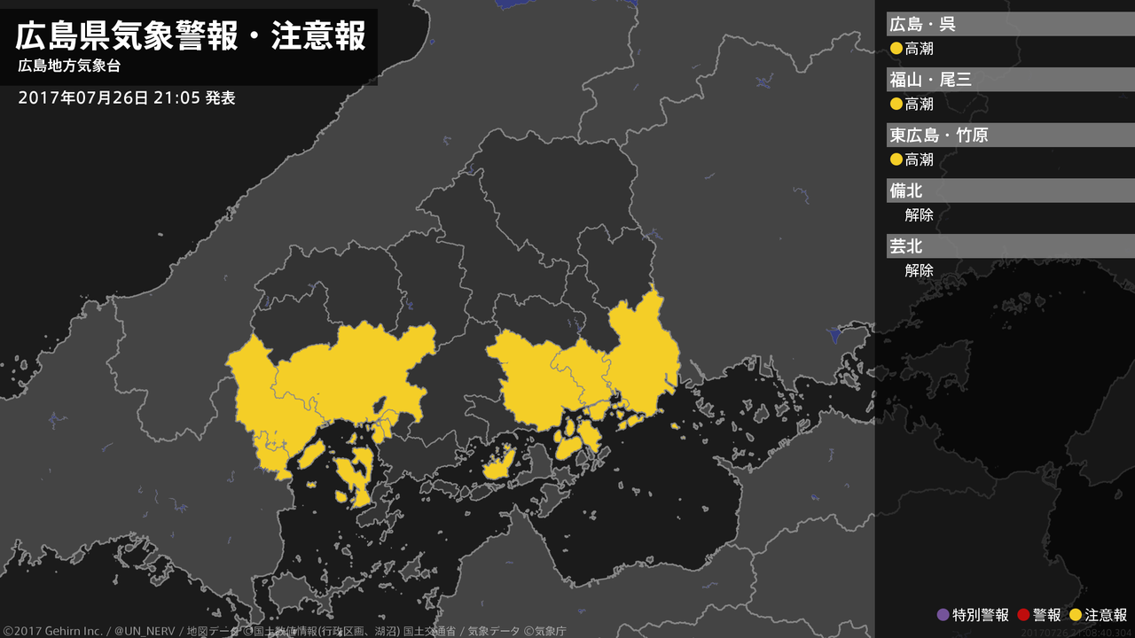【広島県 気象警報・注意報 2017年07月26日 21:08】南部では、27日未明まで高潮に注意してください。#気象警報注意報 #広島県