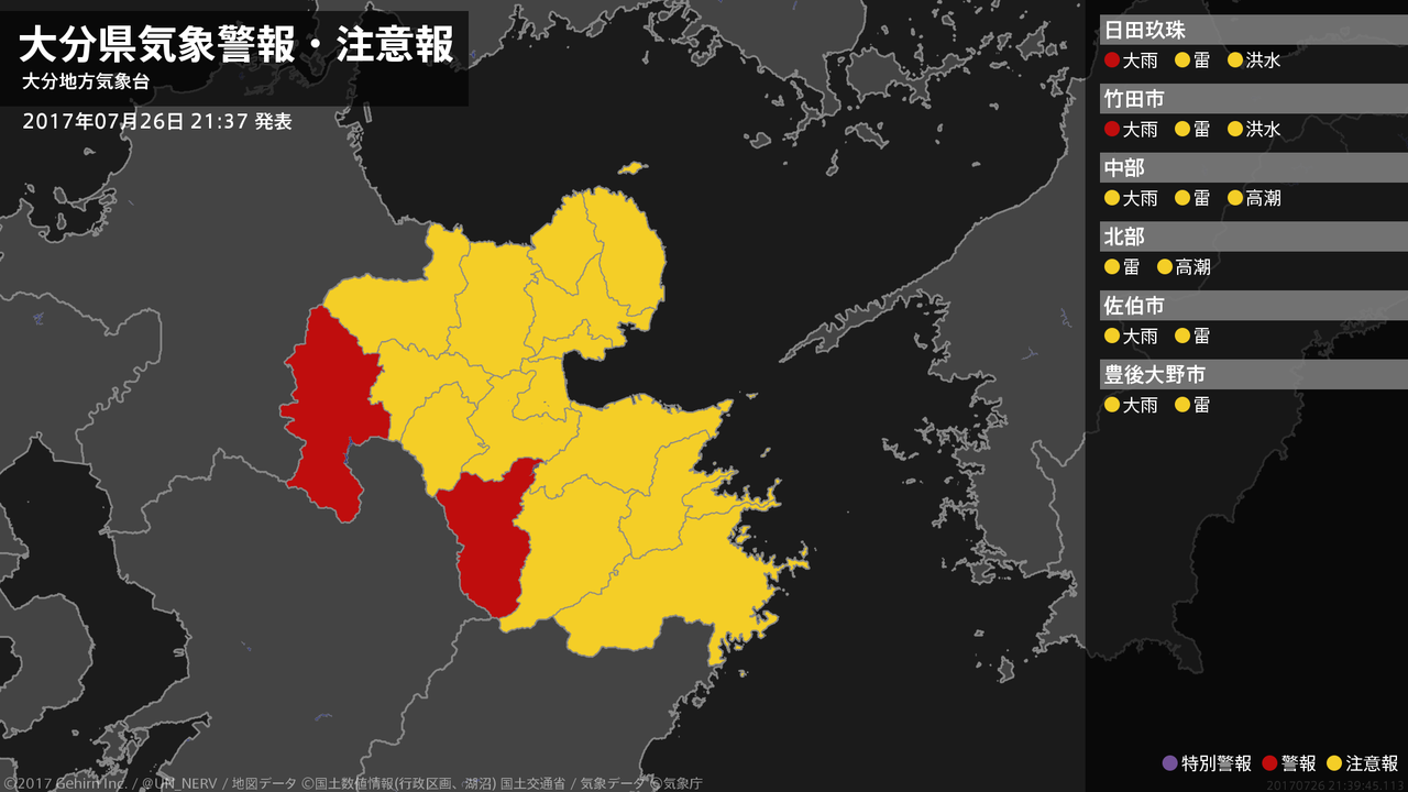 【大分県 気象警報・注意報 2017年07月26日 21:39】西部では、27日明け方まで土砂災害に警戒してください。#気象警報注意報 #大分県