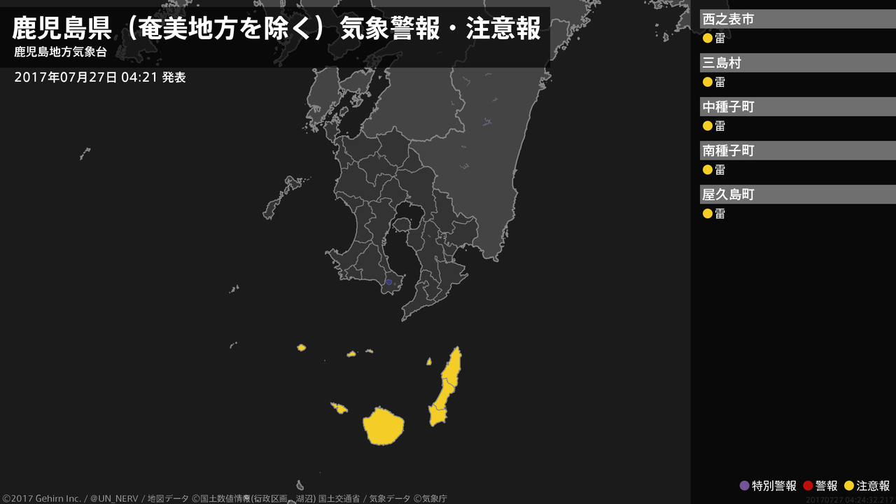 【鹿児島県(奄美地方を除く) 気象警報・注意報 2017年07月27日 04:24】種子島・屋久島地方では、27日夕方まで急な強い雨や落雷に注意してください。#気象警報注意報 #鹿児島県(奄美地方除く)