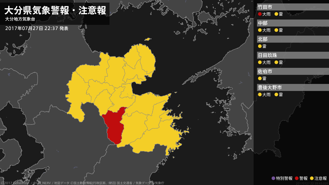 【大分県 気象警報 2017年07月27日 22:39】西部では、28日明け方まで土砂災害に警戒してください。#気象警報 #気象警報注意報 #大分県