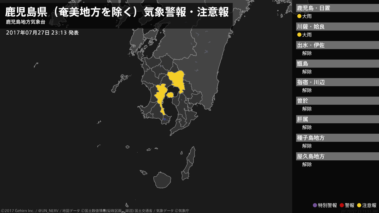 【奄美地方(鹿児島県) 気象警報・注意報 2017年07月27日 22:45】注意報を解除します。#気象警報注意報 #奄美地方