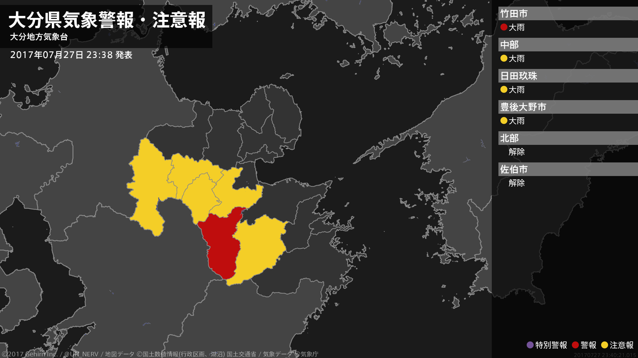 【大分県 気象警報・注意報 2017年07月27日 23:40】西部では、28日明け方まで土砂災害に警戒してください。#気象警報注意報 #大分県
