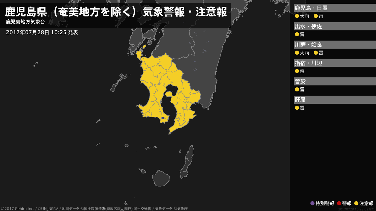【鹿児島県(奄美地方を除く) 気象警報・注意報 2017年07月28日 10:28】