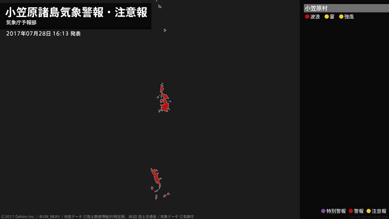 【東京都 気象警報 2017年07月28日 16:16】小笠原諸島では、28日夜遅くから高波に警戒してください。#気象警報 #気象警報注意報 #東京都