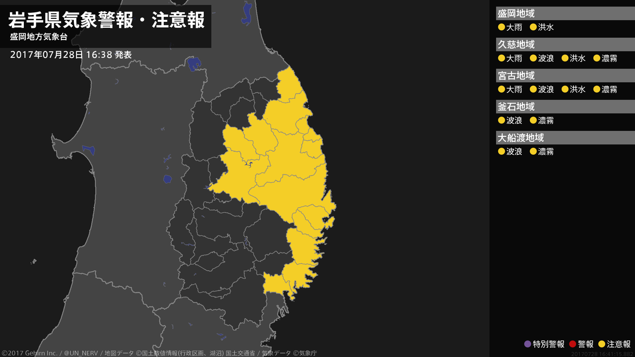 【岩手県 気象警報・注意報 2017年07月28日 16:41】内陸、沿岸北部では、29日明け方まで土砂災害や河川の増水に注意してください。沿岸北部、沿岸南部では、29日夕方まで高波に、29日昼前まで濃霧による視程障害に注意してください。#気象警報注意報 #岩手県