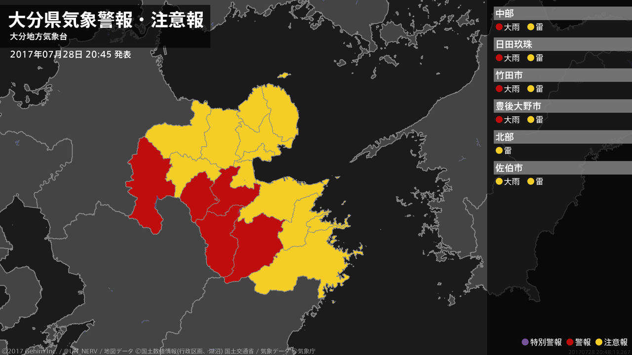 【大分県 気象警報 2017年07月28日 20:48】南部では28日夜遅くまで、西部では29日未明まで、中部では28日夜遅くから29日未明まで、土砂災害に警戒してください。#気象警報 #気象警報注意報 #大分県