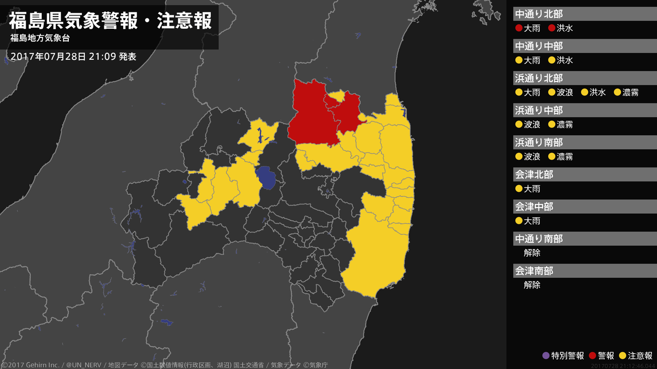 【福島県 気象警報・注意報 2017年07月28日 21:12】中通りでは、28日夜遅くまで土砂災害や河川の増水に警戒してください。#気象警報注意報 #福島県