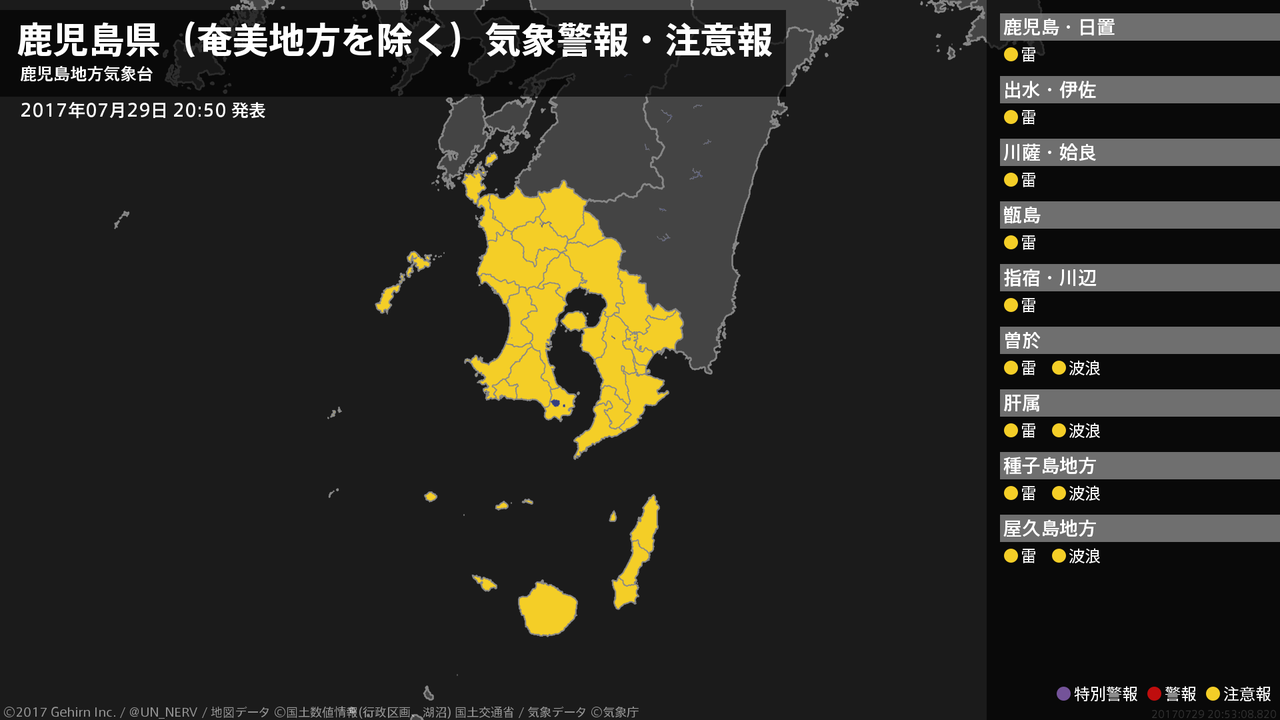 【鹿児島県(奄美地方を除く) 気象警報・注意報 2017年07月29日 20:53】大隅、種子島・屋久島地方では、高波に注意してください。薩摩、大隅、種子島・屋久島地方では、急な強い雨や落雷に注意してください。#気象警報注意報 #鹿児島県(奄美地方除く)