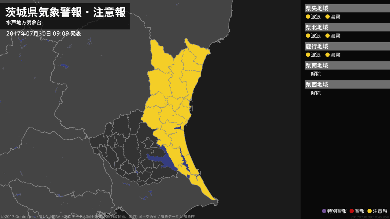 【茨城県 気象警報・注意報 2017年07月30日 09:10】