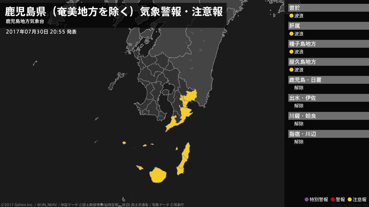 【鹿児島県(奄美地方を除く) 気象警報・注意報 2017年07月30日 20:57】